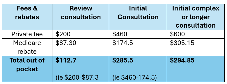 Dr Conway's practice is a private service provider, this means typically payment in full is expected at the time of the appointment. Patients are then able to claim some of the fees back from Medicare if they have a referral letter from their GP.